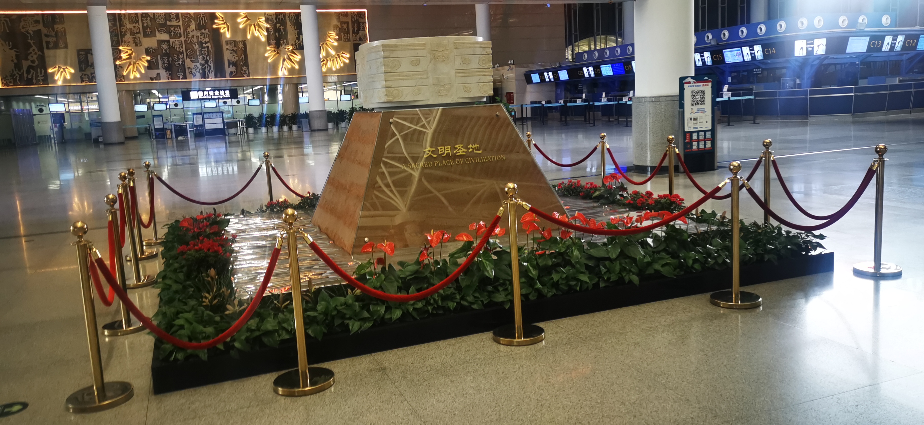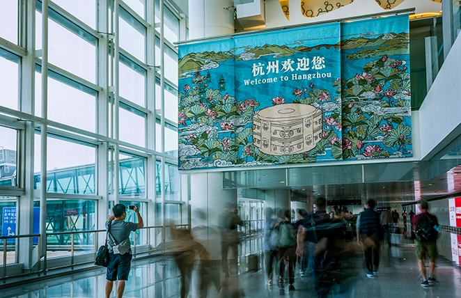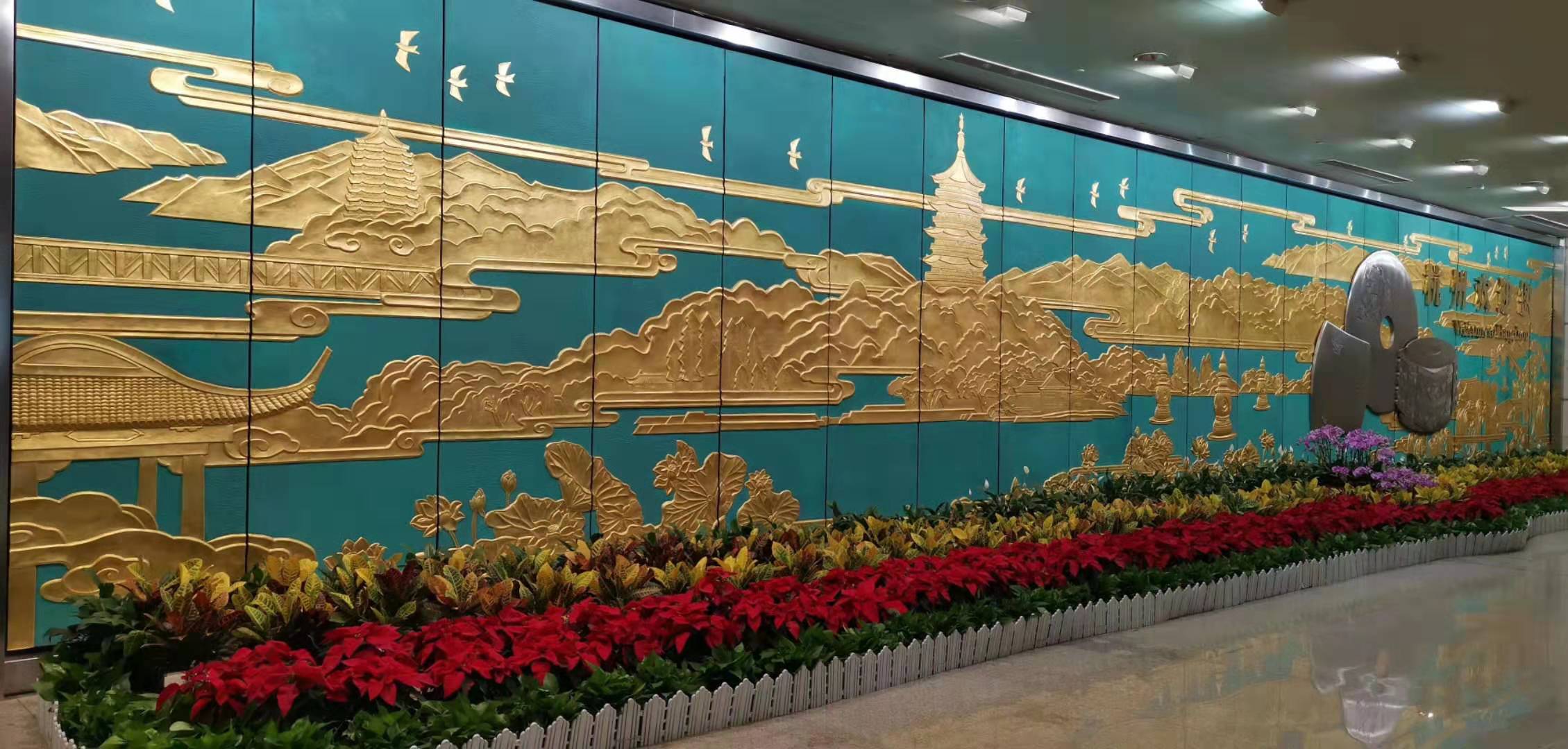 9月初,在良渚文化申遺成功之際,立足杭州地域文化特色和歷史內(nèi)涵,在T3到達層增設(shè)一處包含良渚文化、杭州西湖和運河文化的紫銅浮雕像,在T1航站樓出發(fā)層陳設(shè)大型雕塑——“良渚玉琮”,采用漢白玉石雕刻工藝,對良渚遺址最具代表性的玉琮王進行等比擴大,打造了兼顧藝術(shù)品質(zhì)和文化內(nèi)涵的航站樓長期藝術(shù)景觀,不僅填補了航站樓內(nèi)無固定藝術(shù)展陳的空白,有助于提高航站樓文化品質(zhì)和地域性特點表達能力。