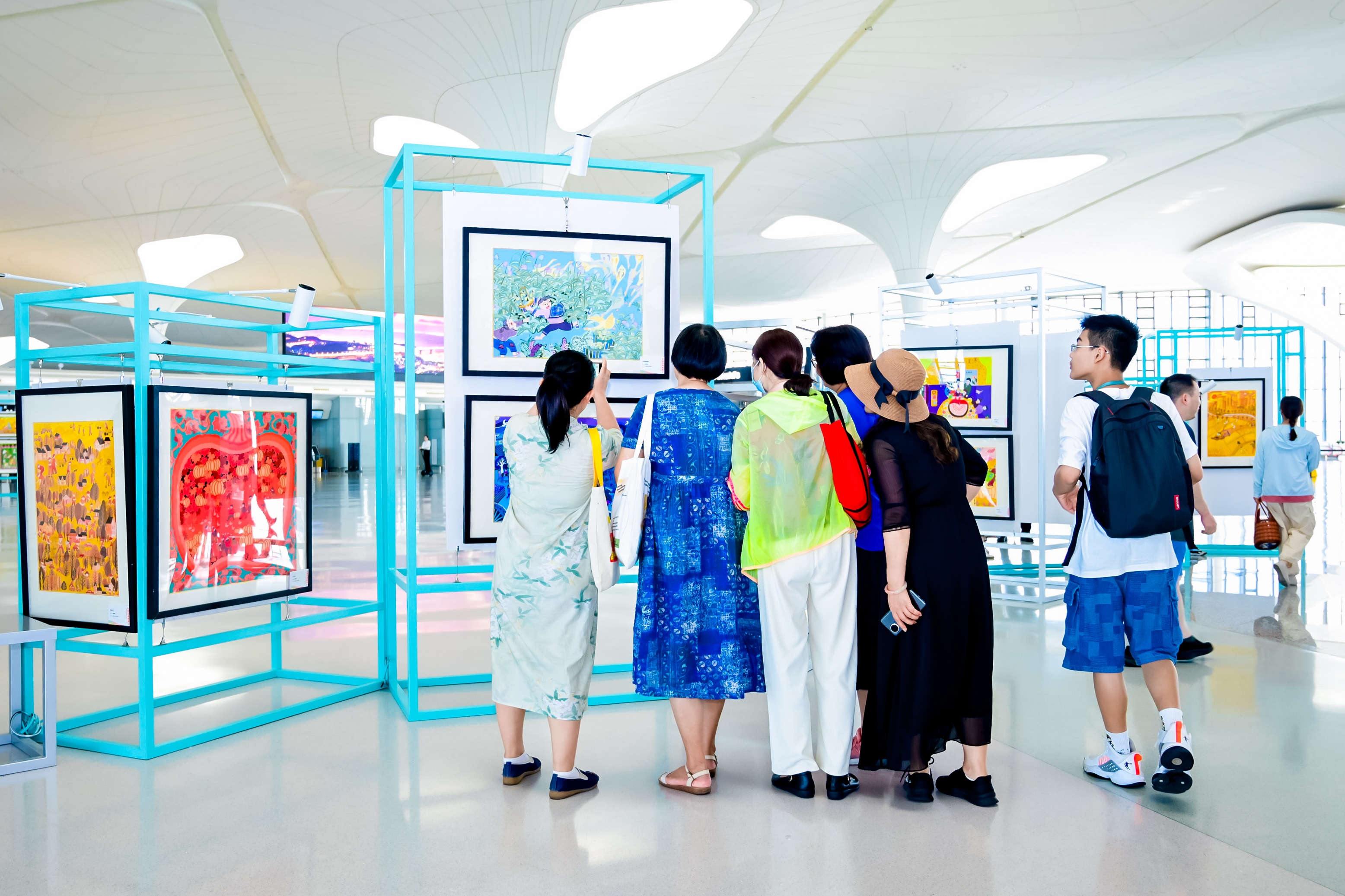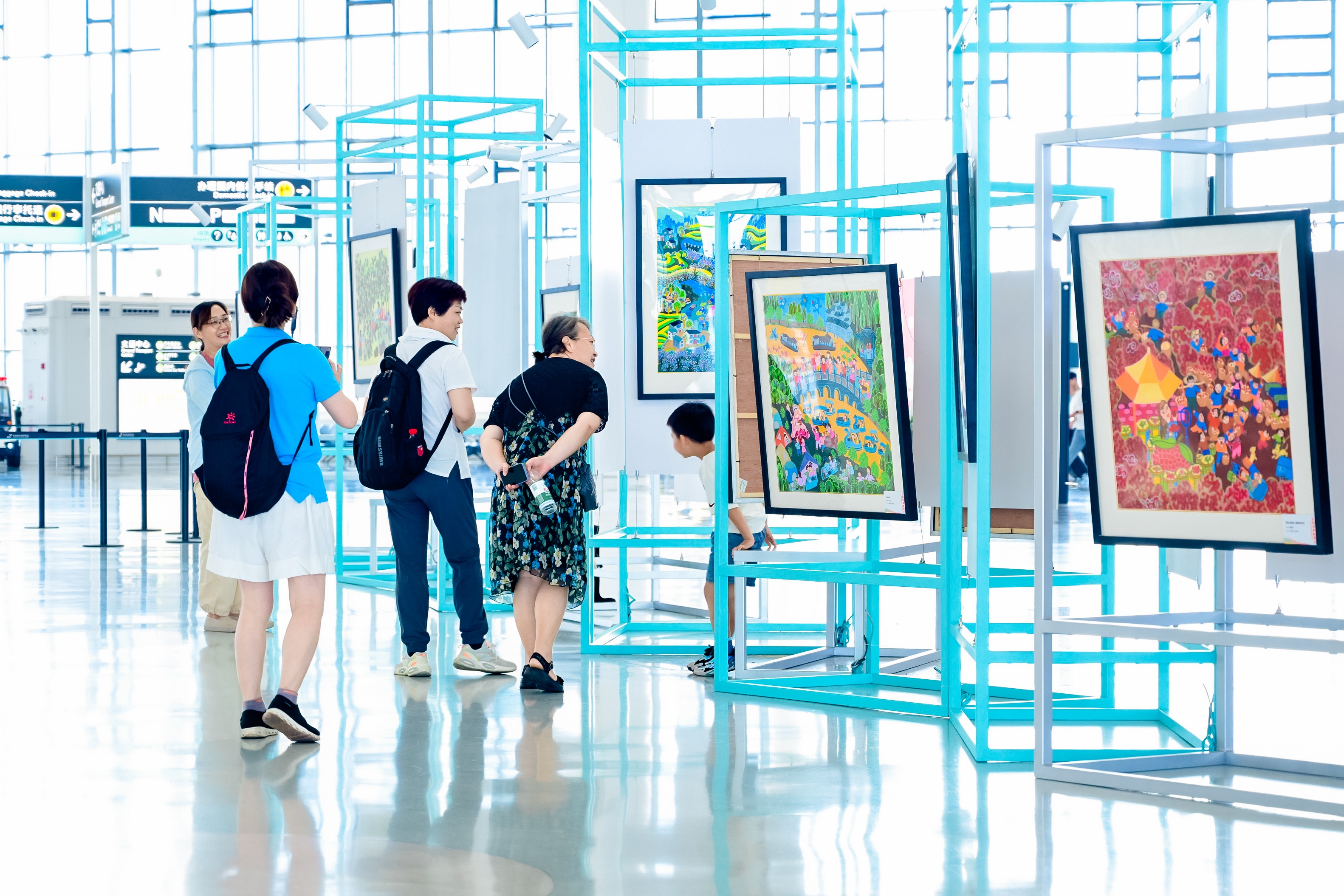 8月27日,杭州機場攜手蕭山區文化館打造的“共富詩畫映蕭山”蕭山區農民畫高級研修班作品展在杭州機場T4出發大廳中庭揭開帷幕。