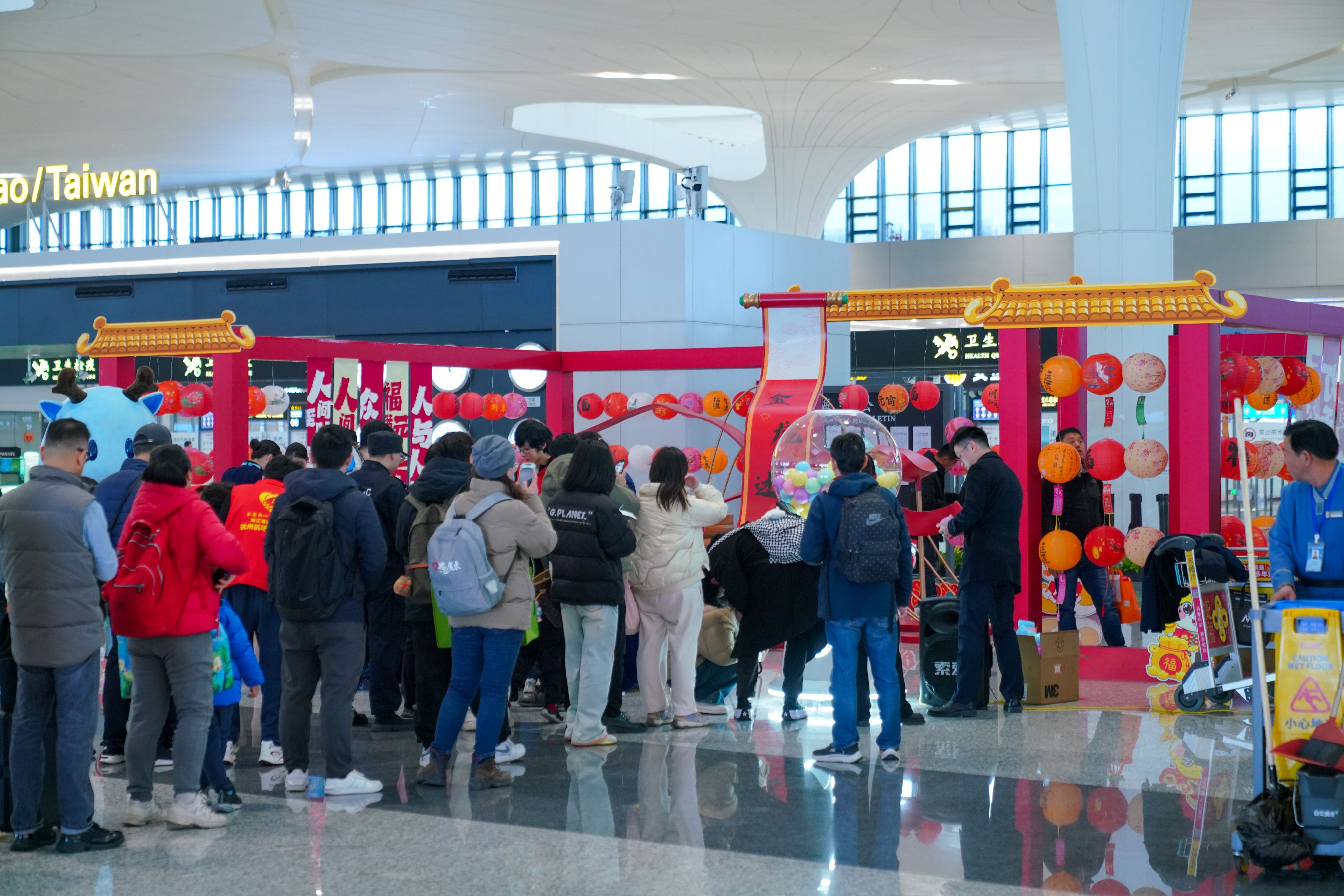 正值元宵佳節,T4出發大廳預安檢兩側熱鬧非凡。上午9時,伴隨著喜慶的音樂,活動正式拉開帷幕?;顒蝇F場,一臺嶄新的扭蛋機最為吸引人群聚集,參與者紛紛投入游戲幣、轉動機器開關,期待著本場最大的獎項——飛機機模與茶壺。